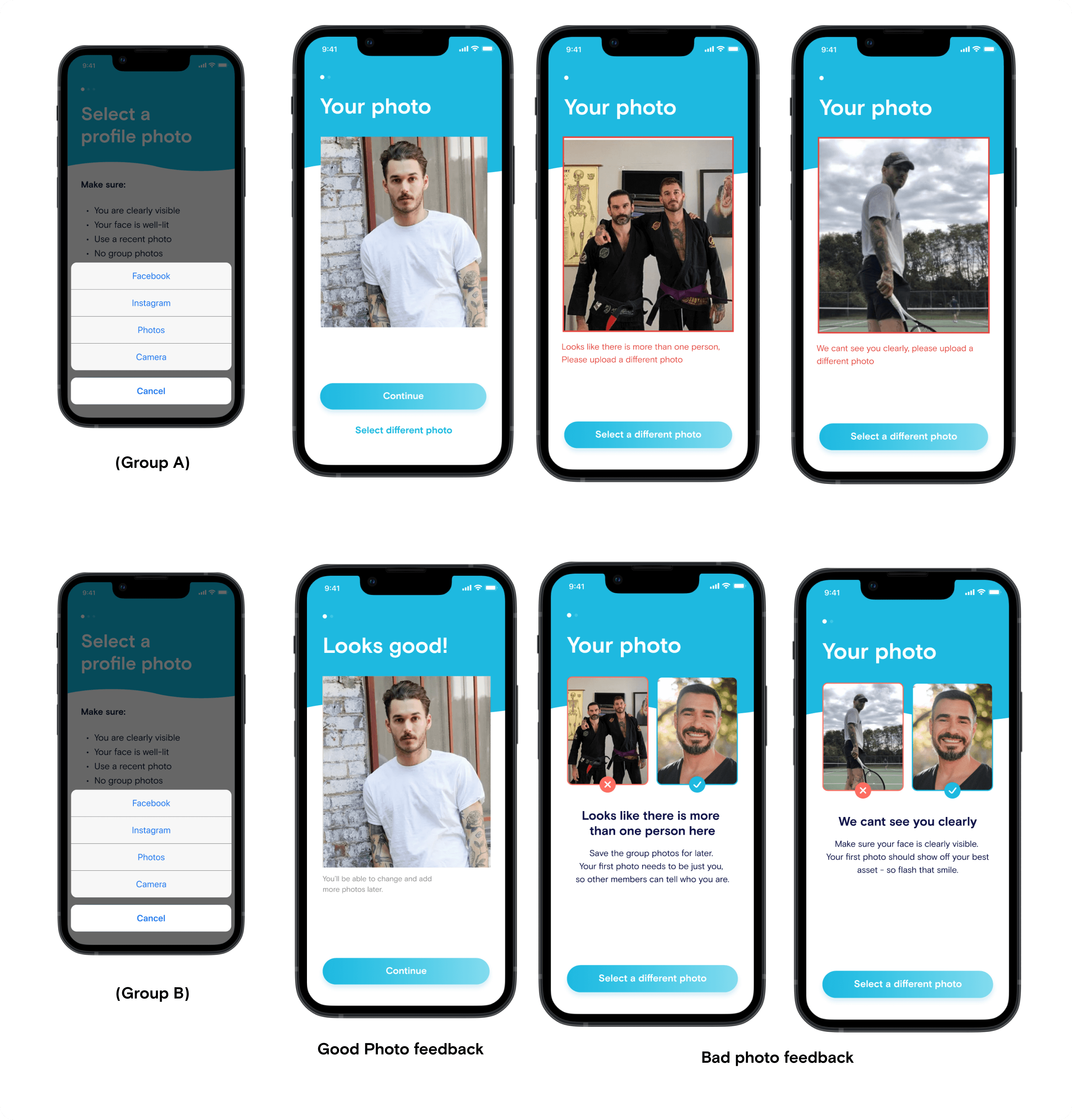 Some of the initial AB tests: AB test #1: Existing upload options - (Group A) VS Visual photo guide - (Group B) AB test #3: Existing face verification intro screen - (Group A) VS Detailed face verification tips - (Group B)