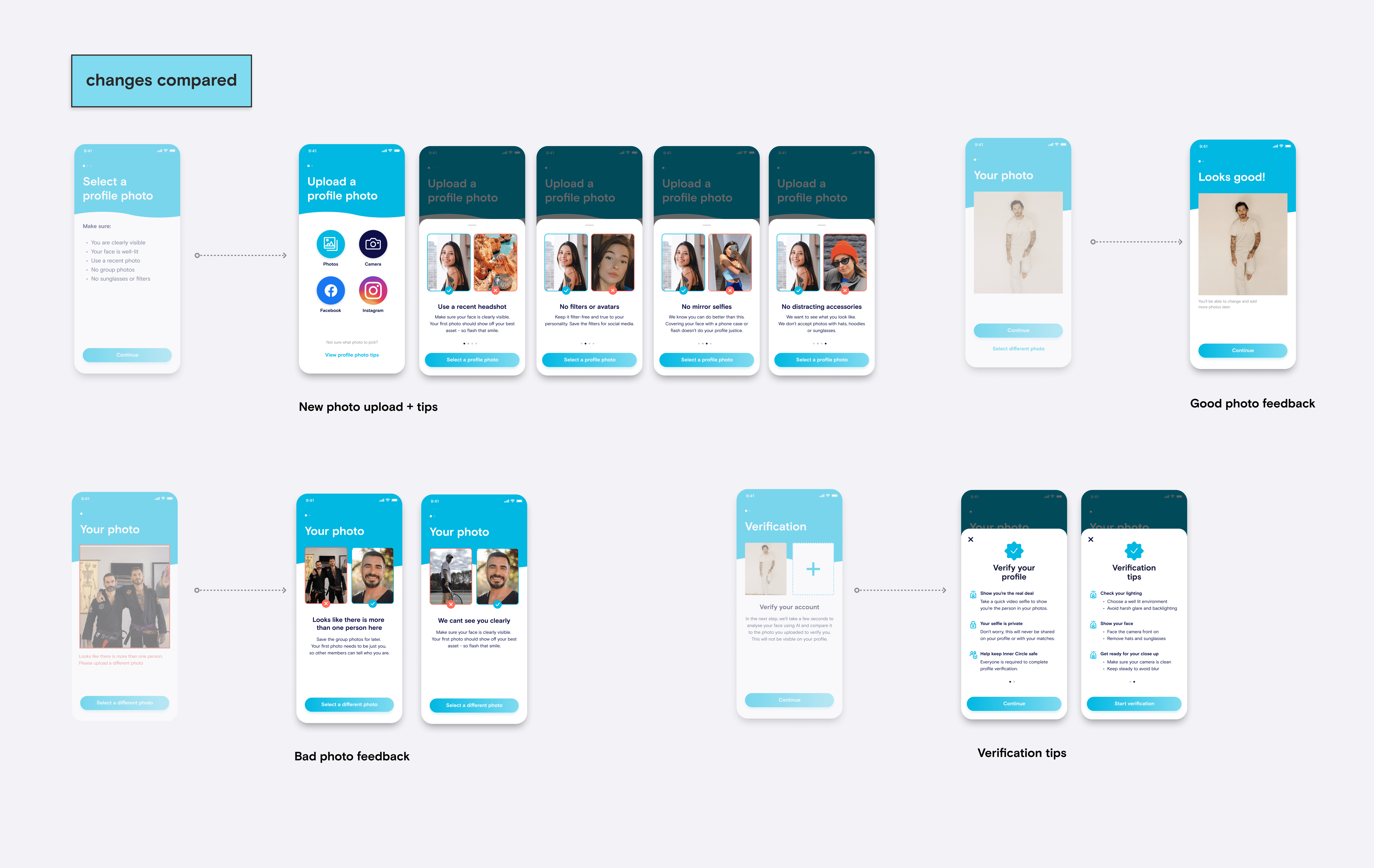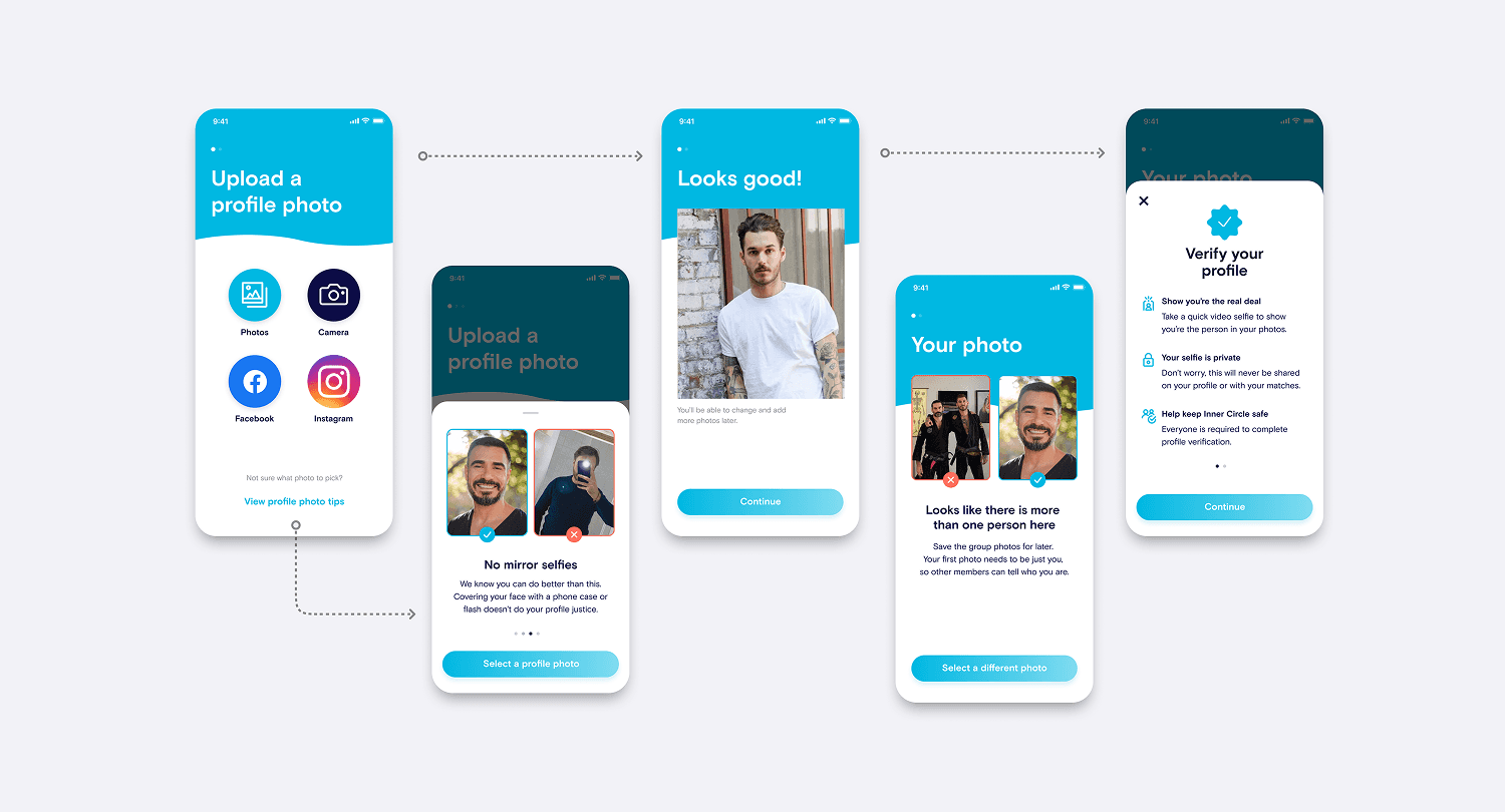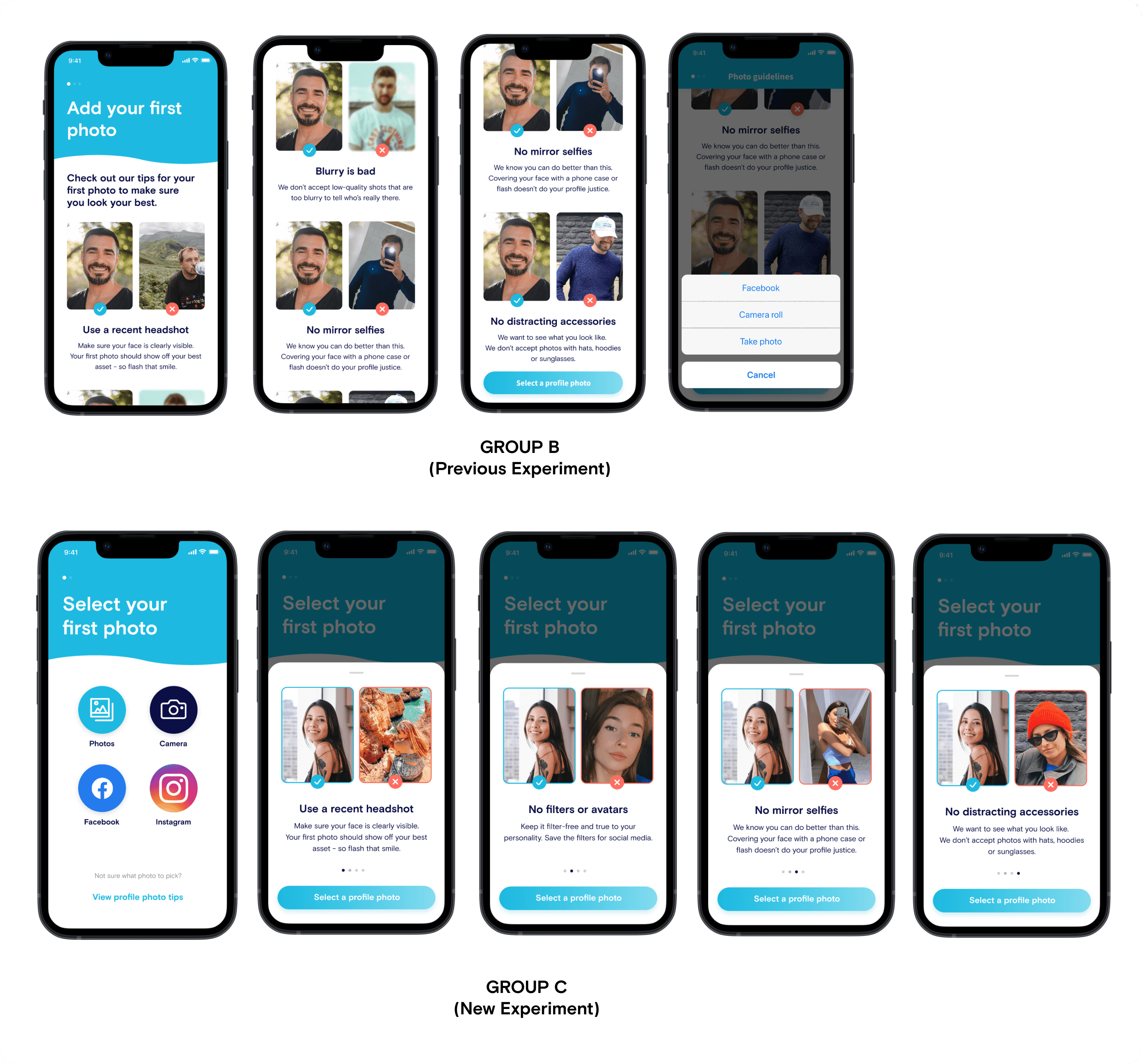 Some of the follow up AB tests: B test #2: Optional photo tips (if female gender is selected) - (Group C) AB test #3: New uploaded photo screen, with good and bad examples - (Group B) AB test #4: New pre-verification photo screen, with additional tips on taking the photo - (Group C)