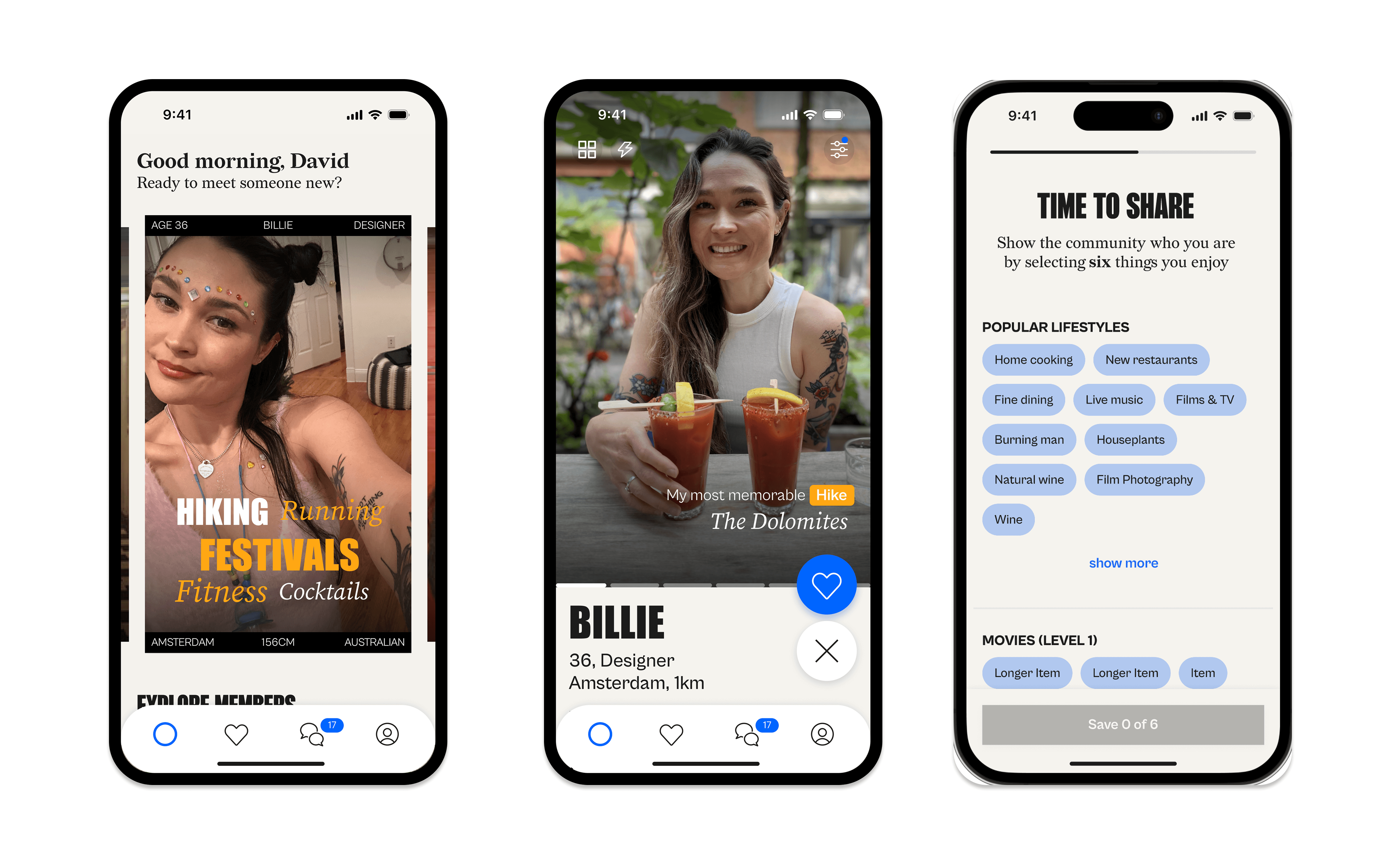 I led the in-app rebrand: re-designing the existing interface, rebuilding the design system from the ground up and translating the new brand identity into a distinctive editorial UI that specifically differentiated us from the typical dating app.